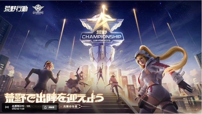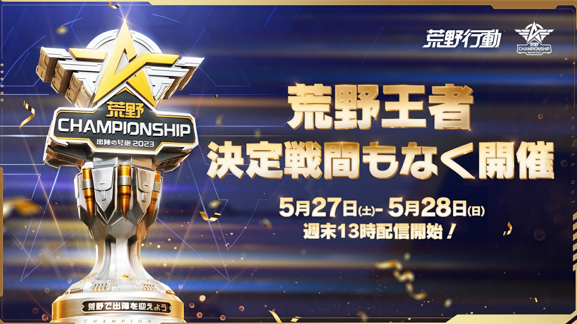 荒野CHAMPIONSHIPとは、1年に一度の荒野行動E-Sportsにおける最高峰の大会です。『2023荒野CHAMPIONSHIP - 出陣の号砲』は、オンライン予選、オンライン突破戦、西日本決勝戦、東日本決勝戦、荒野王者決定戦で構成され、全国からの集まった猛者が自分の実力を証明できる最高の舞台となっています。
