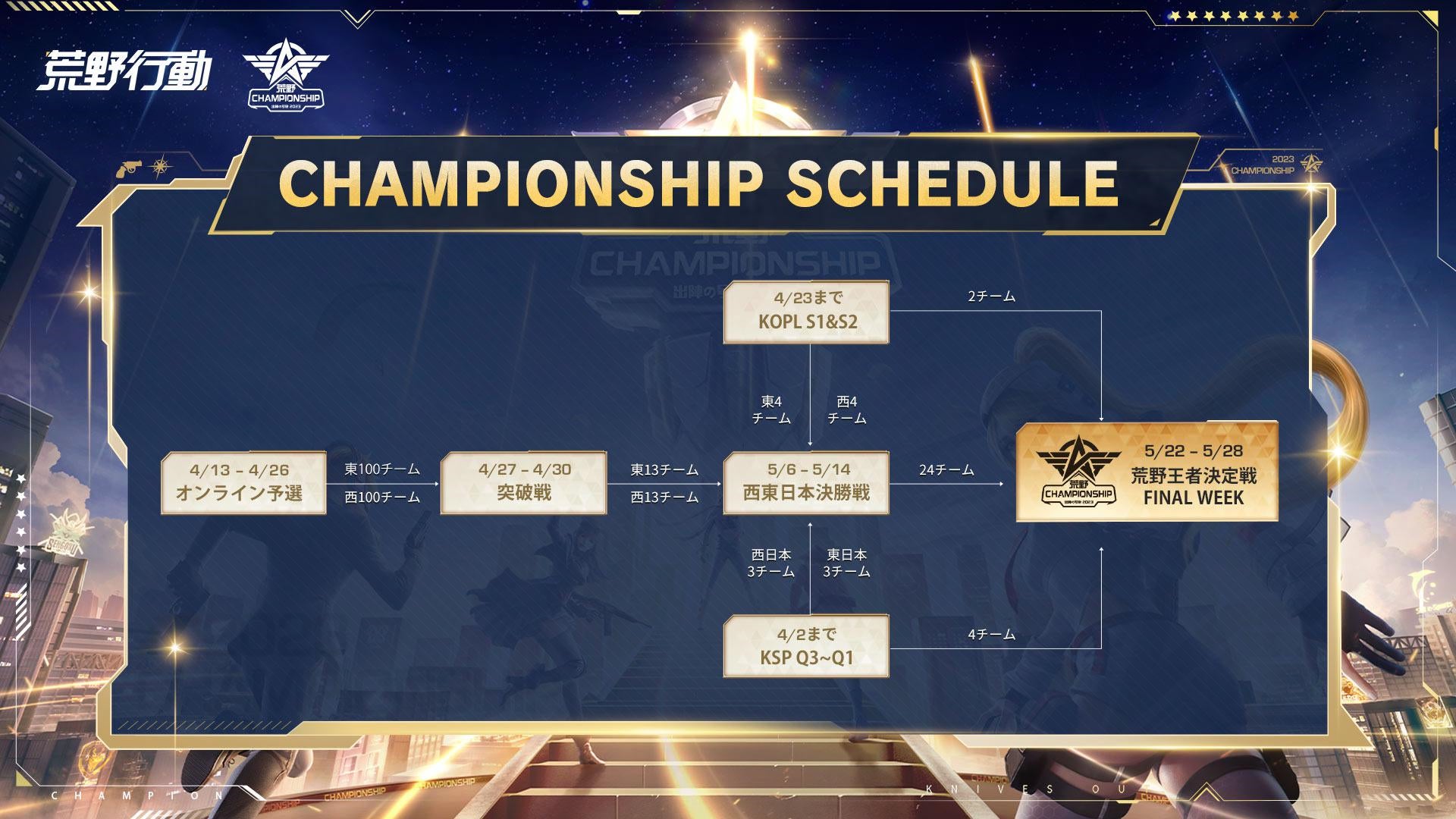 「荒野CHAMPIONSHIP 2023-出陣の号砲」は4月13日にエントリーを開始し、2週間のオンライン予選を経て、全国から集まった200チームの中から26チームがオンライン突破戦に進出しました。そして、彼らは5月6日、7日、13日、14日に公式トップレベルのリーグ戦KOPLとKSPの14のチームと対戦し、西日本/東日本決勝に出場します!