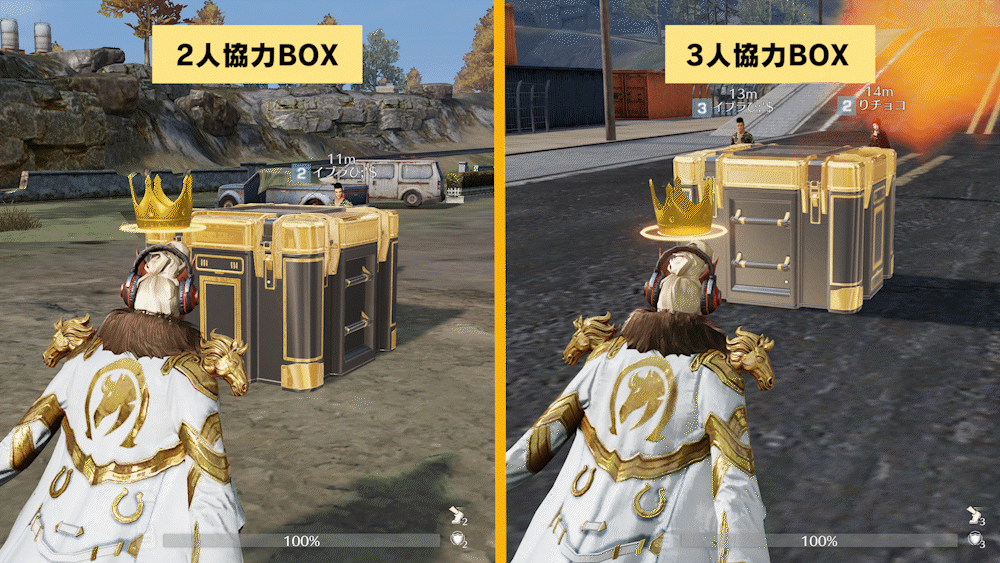 仲間を募集することで大きなメリットがあります!バトル中には2人で開けるBOXや3人で開ける補給物資がマップに出現し、仲間と協力しないと開けられません。豊富な高級物資がチームの勝利を支えてくれるでしょう。