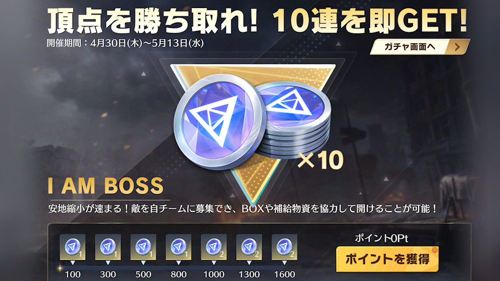 イベント期間中、「I AM BOSS」モードをプレイするとポイントを獲得できます。条件を満たすと「ガチャコイン:人気テーマセレクション」×10を受け取れます。